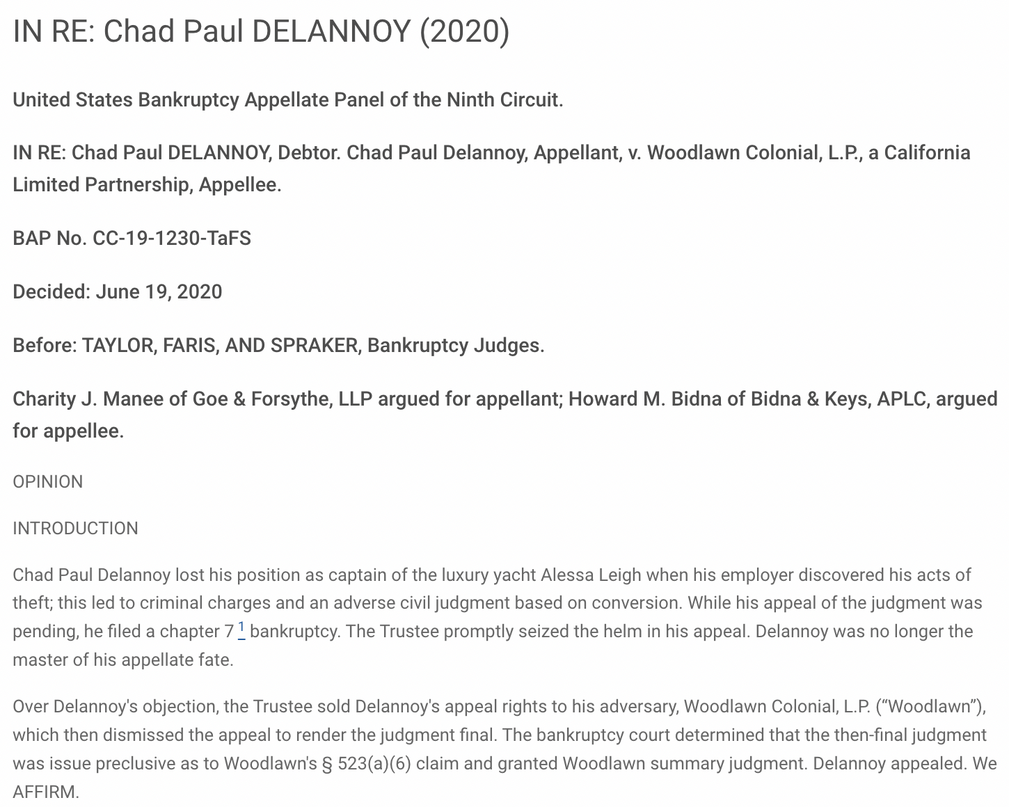 Chad Paul Delannoy lost his position as captain of the luxury yacht Alessa Leigh when his employer discovered his acts of theft; this led to criminal charges and an adverse civil judgment based on conversion. While his appeal of the judgment was pending, he filed a chapter 7 bankruptcy. The Trustee promptly seized the helm in his appeal. Delannoy was no longer the master of his appellate fate.